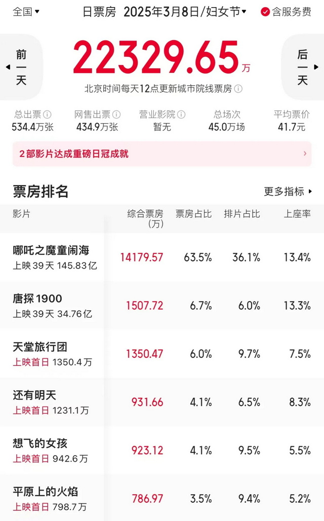 随着《哪吒2》票房持续下滑,整个大盘也在3月3日(周一)回落到了4000万出头,连续三天跌破4000万,跌破全国影院盈亏线,直到上周五才勉强回到8000万,其中《哪吒2》仍旧占据着64.5%的票房。而经历了妇女节档期的周末,昨日,整个大盘只有2885.87万,除了《哪吒2》破千万,其余只有百万出头甚至才几十万。当日大盘成了同期八年来倒数第二,仅好过2022年。