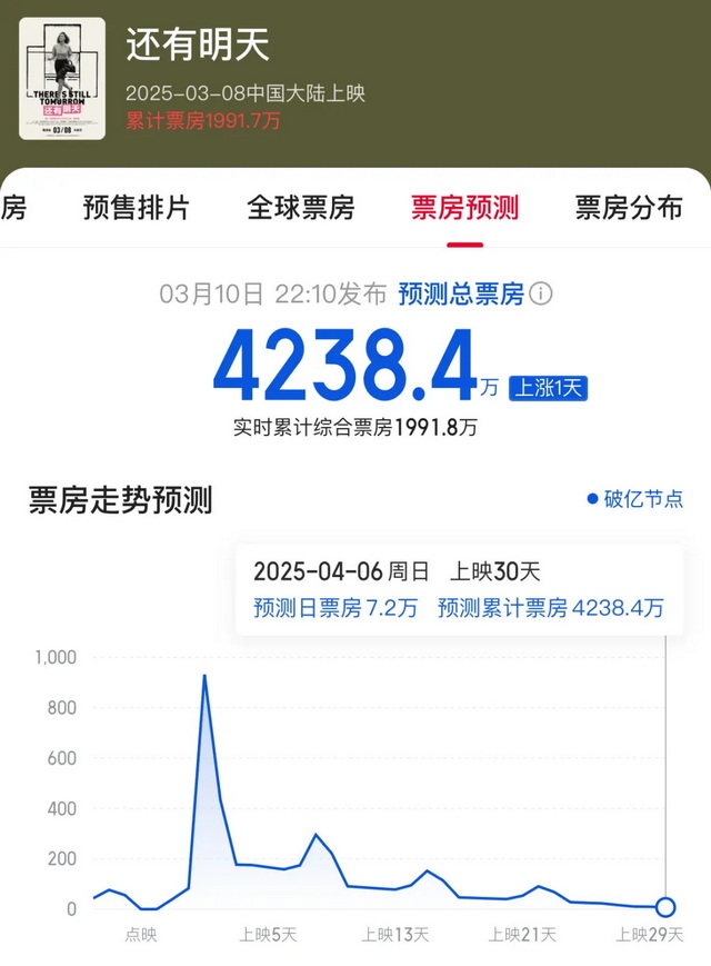 只是,这个妇女节档带来了值得思考的方向,《还有明天》《想飞的女孩》《初步举证》虽然只是千万票房小片,但如果将这几部作品放置在同类作品的坐标系上看,尤其是与去年的文艺电影票房相比,目前的成绩已经不算太差,给3月影市淡季带来了一些热度,也给女性电影档期提供了更多的想象空间。