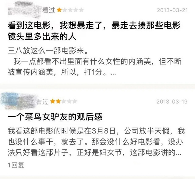 然而,由梅丽尔·斯特里普主演的进口片《铁娘子:坚固柔情》首日票房仅239.8万,宋佳、黄觉主演的《萧红》才46.4万,毫无水花。两部国产片《萧红》《暴走吧,女人》的豆瓣评分只有6.6、4.5,《暴走吧,女人》评论区里更是有观众对妇女节上映这么一部电影大失所望,“看不出女性的内涵美”,也侧面反映出观众对妇女节档上映优质女性电影的需求。