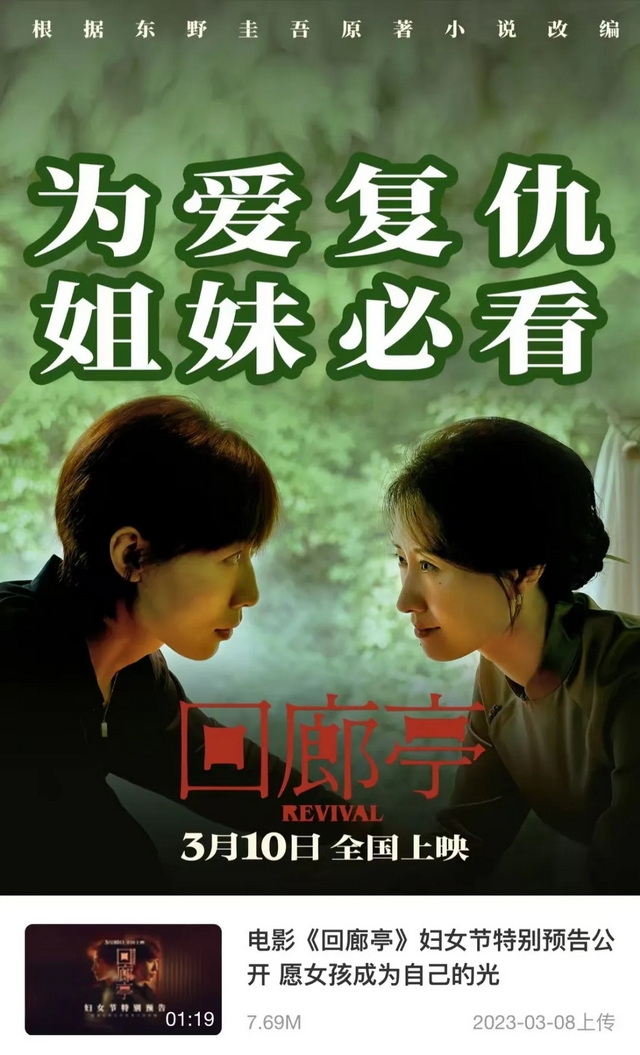 最近几年,随着女性题材与女性观众占比的提高,对女性档期的呼声才有了清晰的落点。2023年,《保你平安》《回廊亭》都在3月8日(周三)开启点映,于周五正式上映。前者讲述了一个为被造黄谣的女生辟谣的故事,在妇女节期间打出“剧组间的女孩有多暖”“女性更容易被造黄谣”等营销话题;后者打着“为爱复仇,姐妹必看”的口号,并在妇女节发布特别预告。