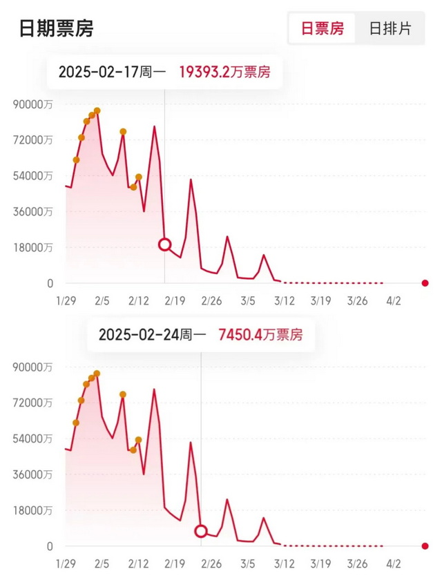 《哪吒2》票房两次断崖式下跌(图源:猫眼专业版)