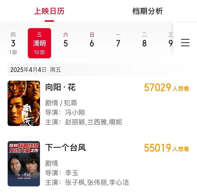 往后看,直至清明档前也并无头部作品定档,《哪吒2》也渐渐探底,大盘颓势尽显。离清明档还有近一个月时间,只有一部进口动作片《疾速追杀4》,四部剧情片《非标准恋爱》《真爱营业》《久别重逢》《我会好好的》,以及重映片《倩女幽魂》是有望破千万的腰部作品,但难救大盘。希望到清明档《向阳·花》《下一个台风》《阳光照耀青春里》上映,市场能够热一点。