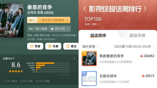 自开播起,《善意的竞争》就常居豆瓣热门榜单前列。大结局当晚,该剧热度值飙升到了5456.8万,创造了豆瓣历史最高热度值,同时,它在微博登顶了影视综超话综合排行总榜第一。