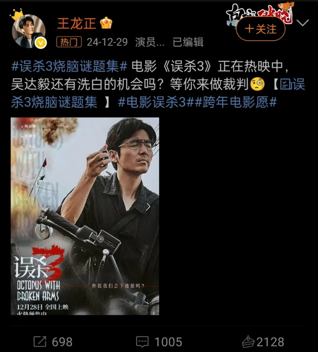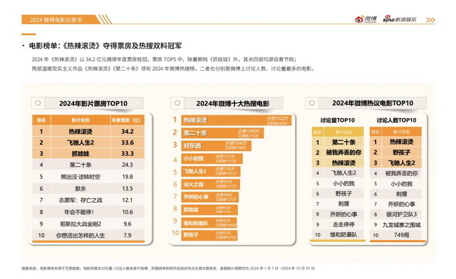在电影作品身上,微博按不同电影项目特性,定制针对性单片营销方案。比如以热搜展示大众情绪共振,实现情绪价值的共鸣种草和观影转化,#热辣滚烫 自私又丰满的女性角色#等犀利女性议题引爆热搜也让《热辣滚烫》斩获高票房;创意升级线上线下的社交互动营销方式,“花小钱办大事”,比如考虑到《误杀3》烧脑的特性,微博上8位主创联合发起答题挑战赛,深挖剧情讨论点,放大映后讨论趣味性,助力影片热议破圈;打造电影+文旅双向赋能模式,助力电影 IP 拓展用户新增量,《白蛇:浮生 》《“骗骗”喜欢你 》等电影IP影响力实现跨领域扩散,同时推动杭州、澳门当地文旅消费升级。
