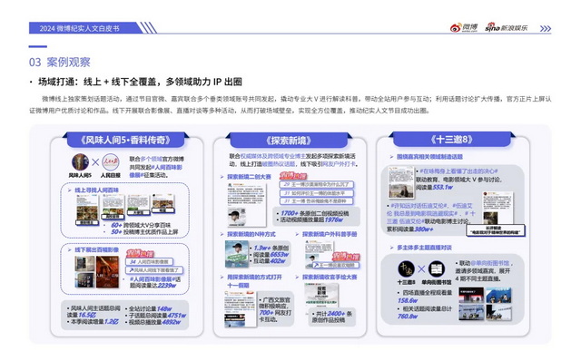 比如法律博主法山叔看完了电影《野孩子》之后,谈到了电影内容与刑法第十七条之间的关系,引出了大量网友对现实议题的讨论,让更多圈层之外的用户关注到这部作品,这背后是微博在全垂类全领域的基底所托举的。又如年度爆款综艺《再见爱人4》吸引了33家主流媒体多角度点评,口碑剧集《追风者》选择举办超前看片会,20家文娱媒体累计发博105条,强势主导口碑初印象,媒体持续“在场”发挥其权威性和引领力。