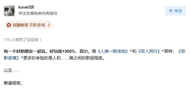 在知乎一则“如何评价双人合作游戏《双影奇境》”的问题下方,一则高赞回答提到,“有一个好的朋友一起玩,好玩度+300%。”游戏本体是不变的,但是游玩伙伴的适配程度,将极大地影响你的游戏体验,甚至于能够触达到多深的情感内核。
