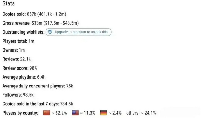 发售当天,《双影奇境》在steam的好评率就高达 97%,同时在线人数超过6万。根据开发商Hazelight Studios在3月11日公布的数据,《双影奇境》发售48小时的销量就突破了100万份,SteamDB数据也显示该时段内在线峰值达到了19.7万人。