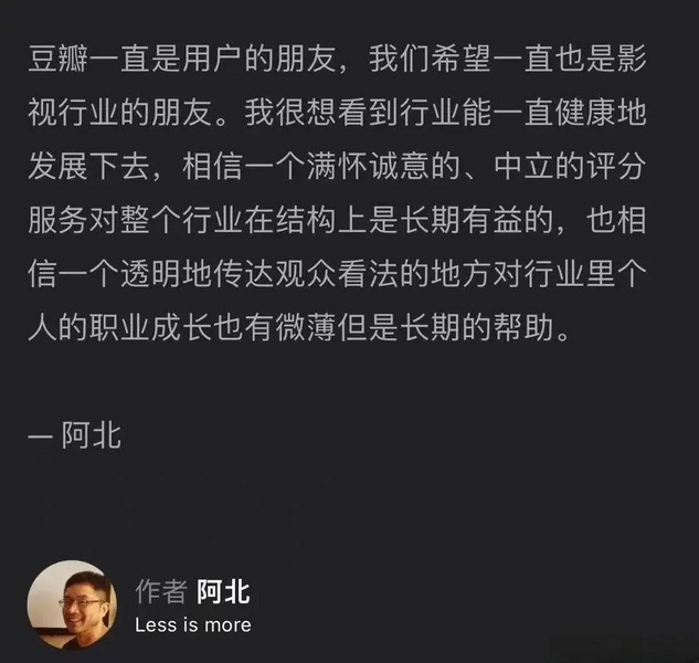 为了规避豆瓣的规则,“养号”成为了“饭圈”和宣发方的共谋,他们增加自身活跃度,为偶像作品打高分,为对家疯狂打低分,干扰了豆瓣评分的正常进行,很多有流量明星参演的作品往往要在上映末期才能出分。很多出品方和粉丝更是把豆瓣评分当成了万恶之源,一旦遭遇口碑滑坡,要么是黑水军,要么豆瓣用户“假清高”和“有眼无珠”,要么就是直接找豆瓣要个说法。对于这些纷纷扰扰,阿北除了在2015年发布《豆瓣电影评分八问》外,并无其他回应。