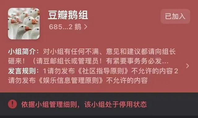 以鹅组为例,在2010年创建,抓住2014年娱乐圈“流量元年”,迅速壮大了自身的影响力。除了娱乐话题,豆瓣小组还无意间承载了很多社会议题的讨论。但这也导致鹅组在2018年2月被停用3天、2019年6月被雪藏一个月、2020年2月又被停用7天。之后,鹅组曾有复活,但仍免不了“到了那一日,最后那一天”,至今仍被停用。