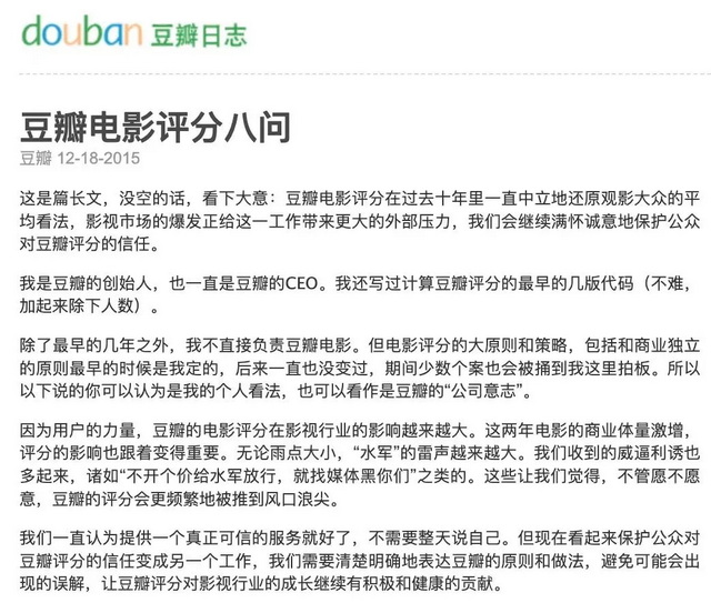 这份“历史文件”,至今仍指导着豆瓣评分的运行,即豆瓣影评是属于大众用户的,不会被少数专业影评或商家操控。
