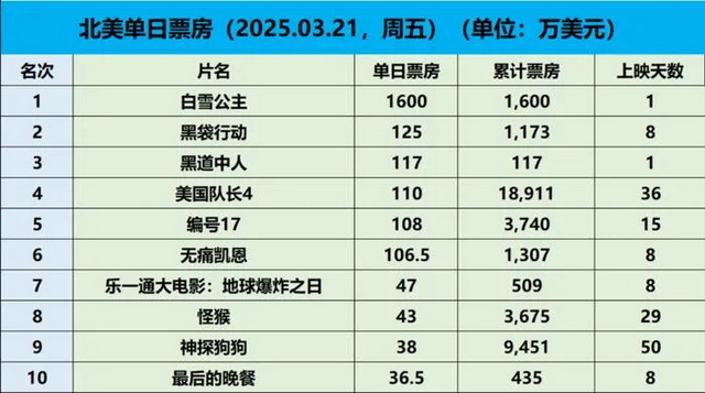据IMDbPro统计,《白雪公主》从21号开始铺开至北美4200家影院,创年度单片开画范围之最,首日票房报收于1626万美元,推动大盘环比上涨逾五倍。随后两天《白雪公主》掘金势头稍弱,首周末以4221万美元登顶,单馆收益为1万美元。