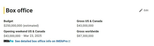 《白雪公主》的困境并不局限于北美院线。据IMDbPro统计,《白雪公主》的海外收益约为4390万美元,与本土合计则超过8610万美元。具体来看,《白雪公主》在英国(497万美元)、意大利(411万美元)、墨西哥(396万美元)、法国(324万美元)、巴西(240万美元)、西班牙(238万美元)、日本(215万美元)、德国(194万美元)和澳大利亚(187万美元)等国亮相,首映破百万美元的市场达到两位数。