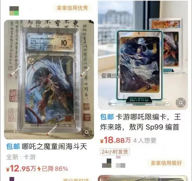 同时,被炒至“天价"的《哪吒2》联名卡通常都是限制编号卡,其中,亲笔签名的、连号的和特殊数字的卖得更贵。这与“谷圈”、球星卡的售卖逻辑相似。
