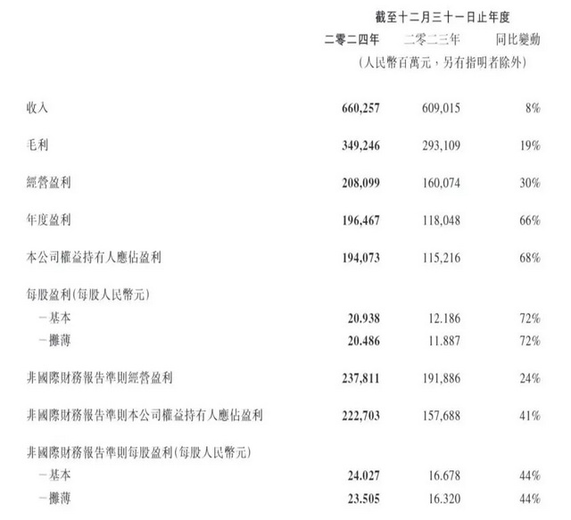 3月19日,腾讯控股发布2024年度财报。数据显示,2024年全年,实现营收6602.6亿元,同比增8%;净利润1,940.7亿元,比上年增长68%;NON-IFRS净利2227亿元,同比增41%。同比增长9.9%。其中,营销服务收入显著增长了20%至1213亿,得益于广告主对视频号、小程序及微信搜一搜广告库存的需求,以及持续升级AI驱动的广告技术平台。其中,游戏、电商、教育及互联网服务行业的广告投放显著增加。