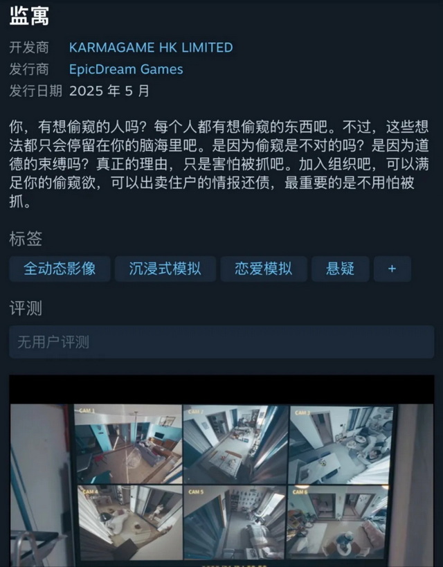 3月26日左右,在3月登顶taptap预约榜榜首的真人恋爱游戏《监寓》下架,甚至国内任何游戏平台都“查无此人”。该制作组EpicDream Games的官方抖音号也已删号。据悉,游戏的运营公司北京羯磨科技有限公司已被举报,受到了当地文旅局的教育整改。