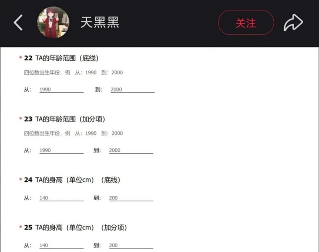 每开始新一期,博主都会给出更新的问卷链接。问卷里需要填写常见的个人介绍,以及对对方的条件要求,包括年龄范围、身高、学历等等,每一项都需要分别填底线和加分项。算分逻辑是,所有底线都满足的情况下,对方的分数才会拿到及格分60分,每有一个加分项匹配则可加1分。
