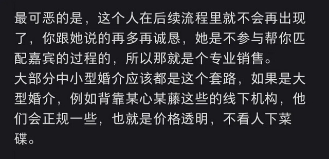 “你会稀里糊涂付了费然后在出门的第一时间就后悔。大部分中小型婚介所应该都是这个套路,大型婚介所可能会正规一些,也就是价格透明,不看人下菜碟。”有网友也在评论区表示同感,甚至怀疑机构介绍的相亲对象是请来的演员。