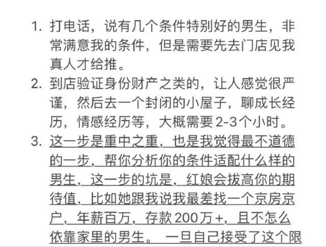 “这个‘红娘’其实就是销售,对方只有一个目的,就是给你定价,看能从你身上薅多少钱。他们没有定价表,多少钱全靠一张嘴。当他们发现你卸下防线,彻底上钩,下一步就是报价。”@天黑黑在帖子里分享道。