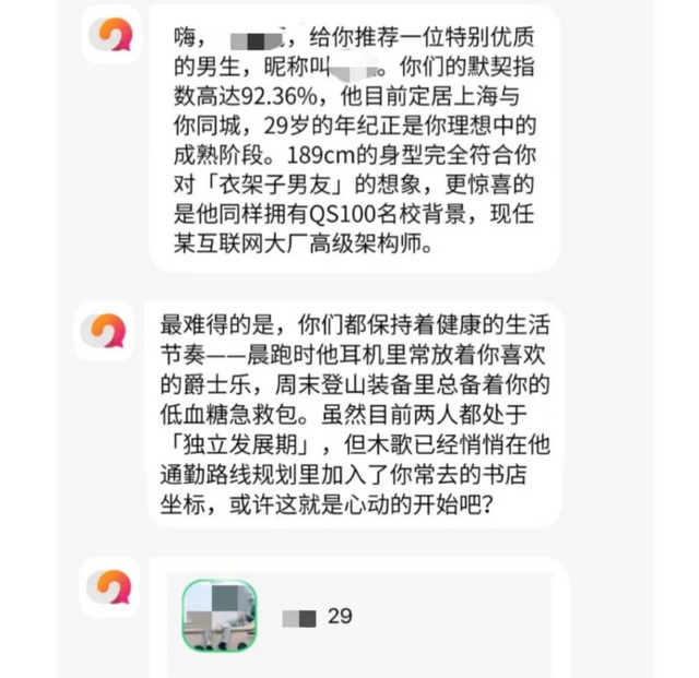 与此同时,有机构正在尝试AI相亲业务,基于DeepSeek创建了AI智能体。填完问卷或许迅速就能够匹配到算法上“合适”的对象,接着建好群,再看谁先主动迈出第一步。“匹配上也不进群”“聊了几句就不了了之”依然是普遍现象,暴露出技术无法解决的核心难题,即情感连接需要真实的勇气而非虚拟的安全感。