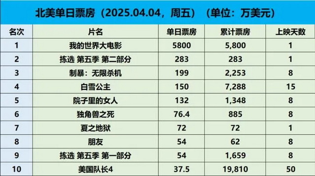 据IMDbPro统计,《我的世界大电影》铺开至北美4263家影院,首日票房爆冲至5711万美元,轻松改写年度单片新高,推动大盘环比飙升近19倍。随后两天《我的世界大电影》走势强劲,周六甚至较前提高4%,最终首周末报收于1.63亿美元,单馆收益达到3.8万美元。