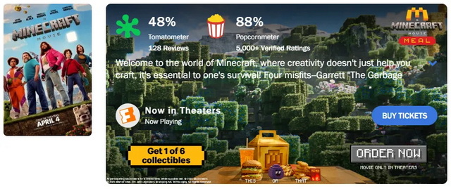 这一成绩无悬念打破年度开画纪录,将《美国队长4:美丽新世界》(8884万美元)甩在身后。在游戏改编电影序列中,《我的世界大电影》也空降至头名,甚至高于两年前的《超级马力欧兄弟大电影》,不过后者在4月第一个周三登场,首周末票房为1.46亿美元,计入工作日收益则超过2亿美元。