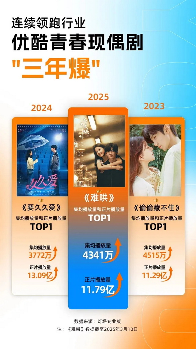 《偷偷藏不住》《难哄》两部现偶一改市场传统印象,前者以热播期集均4233万播放量成为2022—2024年全平台独播现偶冠军,创下优酷该题材历史新高;后者更以10736的站内热度值刷新成绩,不仅成为优酷改版后热度最快破万的剧集,更一举打破了优酷现代剧预约量纪录。值得注意的是,这两部剧在商业层面同样表现抢眼,包揽了现偶招商和客户数量的双料冠军。