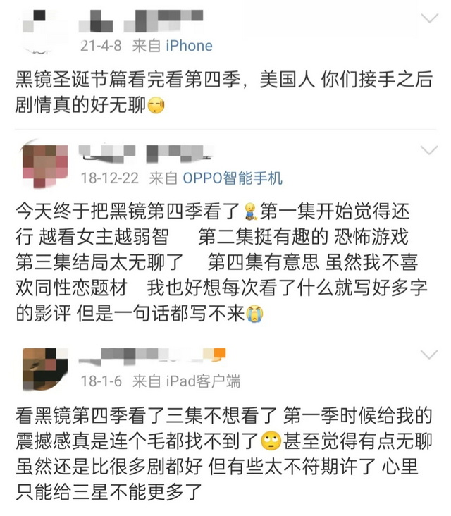 自从《黑镜》投入Netflix的怀抱后,观众开始察觉到《黑镜》的变化。从第三季开始,《黑镜》的科幻惊悚感开始慢慢减少,有了团圆美好的结局,到了第四季这种趋势更加明显。英式冷峻讽刺慢慢失去了锋利。