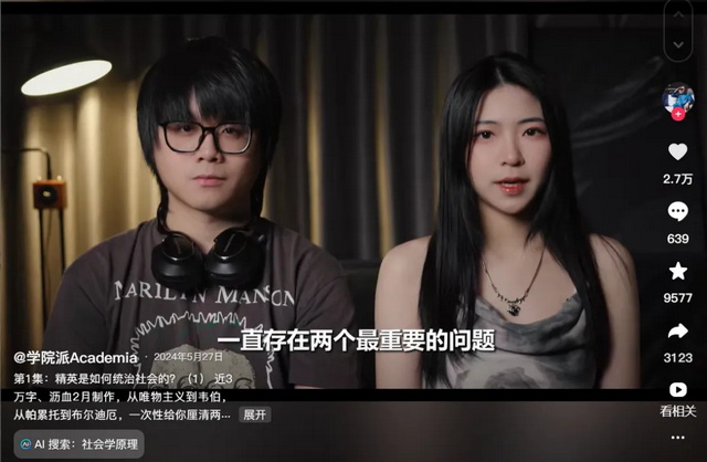 主打“把世界顶尖大学的知识漂洋过海带给你”的博主@学院派Academia也是从2024年开始在抖音上传视频,“哈里斯败选后的民主党失败史”“消费主义如何控制全世界”“中美对账”等视频都在抖音收获不小热度。