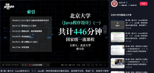 2024年底,北京大学就已经在抖音、抖音精选独家发布12门信息技术学科的完整版课程,并收获超6600万次播放、230万次点赞、175万次收藏,北大抖音号涨粉65万。