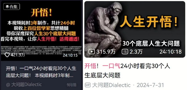 2024年7月,抖音知识区博主@大问题Dialectic上传一支名为“开悟!一口气24小时看完30个人生底层大问题!”的视频。字幕上更是标明该支视频耗时3年,“吸收上百位哲学家思想精髓,看完本视频,让你人生开悟!活得通透!”。