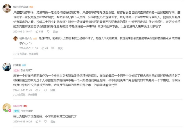 打开知识区博主们的评论区,一屏都滑不完的长评比比皆是。以@大问题Dialectic的“开悟!一口气24小时看完30个人生底层大问题!”视频为例,大量B站用户在评论区从生物学、哲学、社会学角度讨论这30个底层问题,加缪、王阳明、克尔凯郭尔更是频频“出场”,用以佐证各自理论。