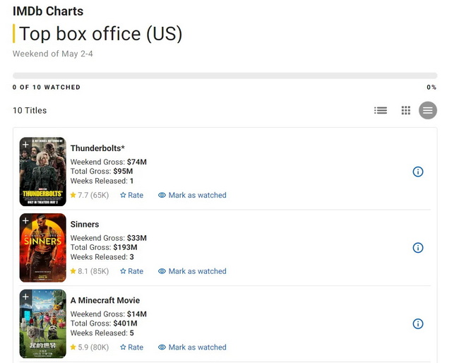 受到《雷霆特攻队*》的支撑,北美周末大盘微跌1.7%至1.44亿美元,已连续六周维持在亿元线上。在刚过去的4月份,得益于《我的世界大电影》和《罪人》双强驱动,北美月度总票房录得8.75亿美元,较去年同期暴涨103.5%,创下史上第四高的4月收益。进入暑期档,对比去年《特技狂人》领衔时的温吞开局,今夏漫威巨制归位打响头炮,让市场继续在高位运转。