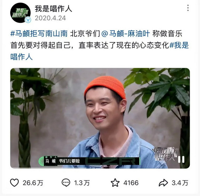 这一次火的不是他的音乐,而是网友考古马頔在《我是唱作人2》中的谈话片段,“《南山南》那种歌,说实话分分钟写出来,不用一星期,三天!”“为什么我不写了?(啪啪啪拍脸)爷们儿要脸……咱是一北京孩子,首先得对得起自己。”