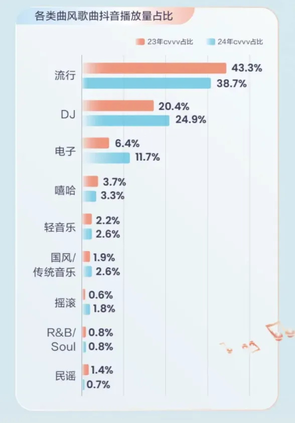 从不久前发布的《抖音X汽水音乐:2024音乐行业年度观察》中可以看到,民谣播放量已经输给最近又重新流行起来的R&B,排名垫底。