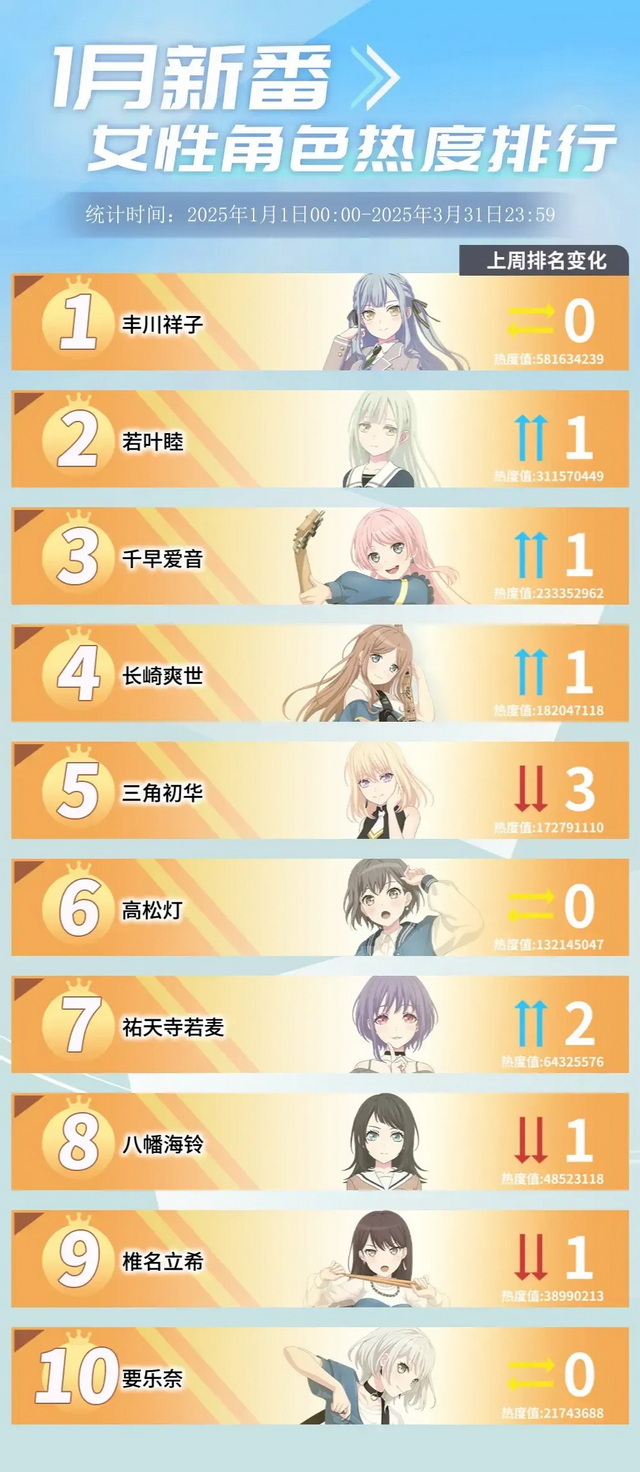 2025年1月,随着续作《BanG Dream! Ave Mujica》(《颂乐人偶》以下简称《Mujica》)的上线,这股浪潮达到顶峰,虽然动画质量为人诟病,但数据却再创新高,在需要开通B站大会员才可观看的前提下,每集同时收看人数超过10万人,而在播出的3个月里,《Mujica》垄断了B站动漫各类热度榜的头名位置(男性角色榜除外),是第二位《坂本日常》的近10倍,在女性角色热度榜中,《Mujica》更是垄断前十名长达3个月,仅丰川祥子一个角色的热度,就超越了前三个季度女性角色榜前十的总和。