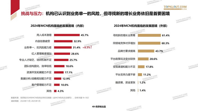 当前,用人成本激增、内容创意疲劳、红人管理难度增加等问题,依旧是MCN机构面临的主要困境,“业务单一,抗风险能力差”是机构们最关注的问题。