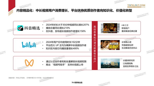 过去一年,中长视频用户消费持续增长,各大平台都开始扶持优质创作者向知识化、价值化转型,希望通过高信息量和沉浸式叙事吸引更多用户。