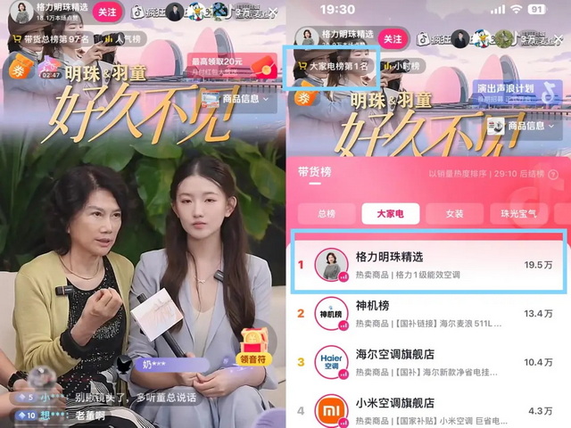 在“520新情人节”官宣和好后的第三天,董明珠和她曾经批评过“连一个文都写不出来”的前秘书孟羽童,一同出现在格力明珠精选抖音直播间。在5月23日晚上7时正式开播时,就引来2万观众在线观看,在开播30分钟后,带货成绩登上“大家电榜”第1名。