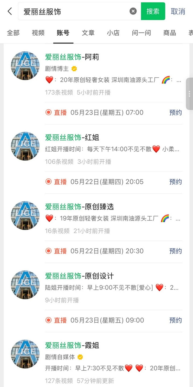 主账号@爱丽丝服饰ALICE主打成熟女性的体面,陆姐在直播中穿着醋酸连衣裙讲解面料;@爱丽丝服饰-阿莉则聚焦家庭场景,主播阿莉系着围裙展示舒适家居服;新账号@爱丽丝服饰-原创臻选专门讲述服装工艺,从纽扣选择到缝线密度,满足高净值用户对“品质感”的苛求。