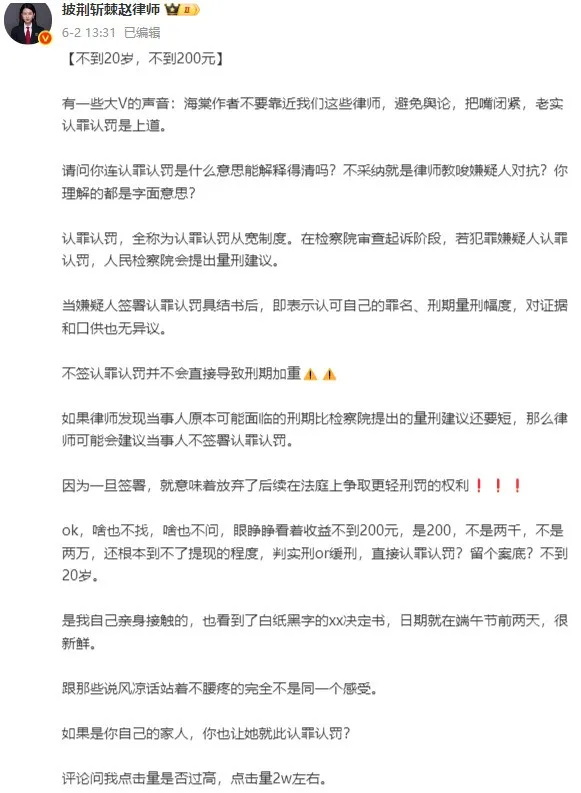 网上有律师自愿为涉案作者辩护(图源:@披荆斩棘赵律师)