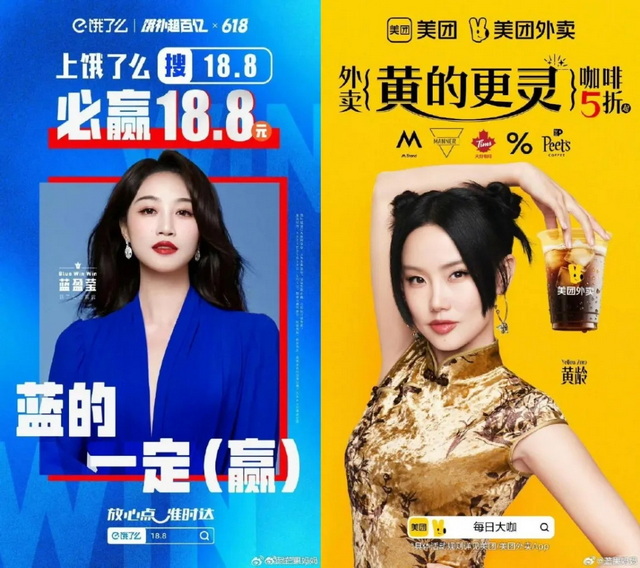 美团、饿了么开始使用“谐音梗代言人”。主题色为黄色的美团率先发力,起用歌手黄龄,意为“黄的灵”,另一边的饿了么也不甘示弱,迅速请到演员蓝盈莹作为“饿了么必赢官”,标语为“蓝的一定赢”。