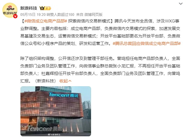 5月14日,腾讯发布一季度财报。与此同时,微信发布全员信,宣布原微信开放平台基础部负责人曾鸣将负责电商产品部,直接对张小龙汇报。电商产品部将负责“微信内交易模式探索,加速发展交易基建及交易生态,运营微信交易新模式”。
