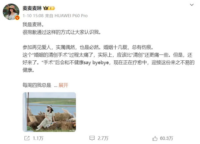 在麦琳已经告别《再见爱人》,开始在社交平台发布内容后,也会面对观众的各样指责、抵制。