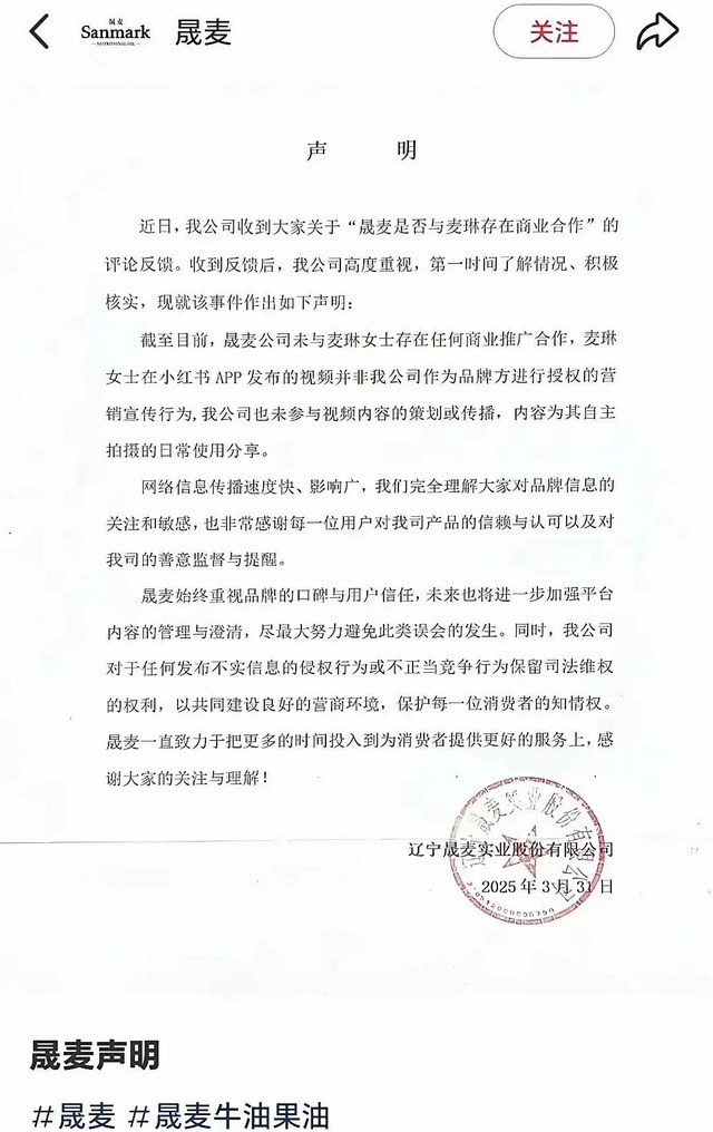 最终该品牌被逼无奈发布声明称与麦琳并无合作,只是麦琳的个人日常分享。但这并未满足网友的“抵制欲”,还是让品牌以“侵权”为由,让麦琳删除视频。