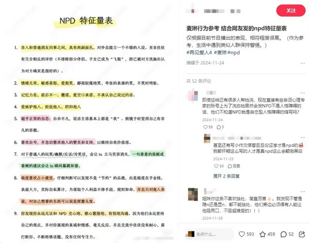 节目表现是最直接也是最根本原因。在综艺《再见爱人4》里,麦琳是一个“自私”“双标”“言行不一”“控制欲强”“拧巴”的家庭主妇,她对李行亮强势又控制,被不少观众认为是“NPD”代表。
