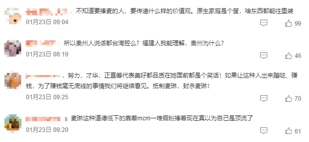 网友们抵制麦琳的话术至此多了一条,“通过减肥逆袭、容貌焦虑等争议话题获取流量”,还有网友更上一个高度,认为麦琳言行“与主流价值观相悖”,“如果黑红流量能变现的话,国家公民从小所受教育的美好品质将变得一文不值”此类话术频频出现在麦琳相关帖子下方。