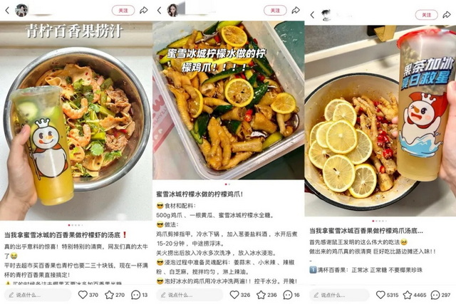 而蜜雪冰城自建柠檬种植基地、实现果酱茶叶全自产的供应链优势,让产品天然具备预制调料属性。小红书上“零失败”“懒人必备”的标签高频出现,也反映出年轻群体对便捷烹饪的强烈需求。