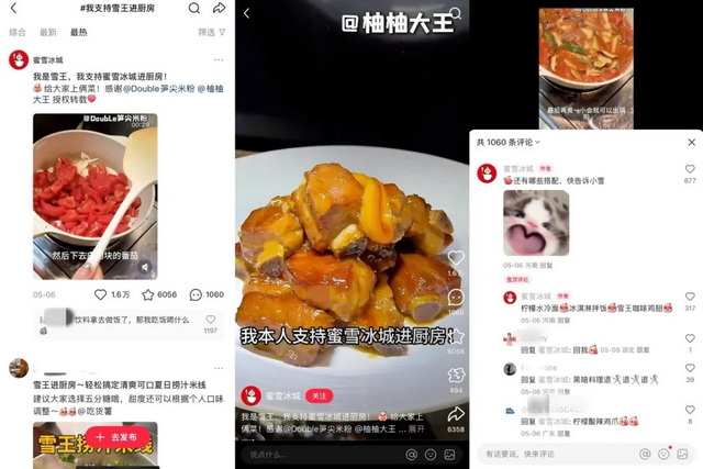 而官方的积极下场,进一步助推了这场创意狂欢。蜜雪冰城不仅将用户菜谱搬上官方账号,更以#我支持蜜雪冰城进厨房 的话题发起互动。