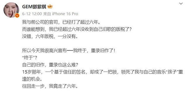 6月12日,邓紫棋的重录专辑《I AM GLORIA》上线,是过去12首旧曲的重录。此举,正是为了解决她的版税问题。