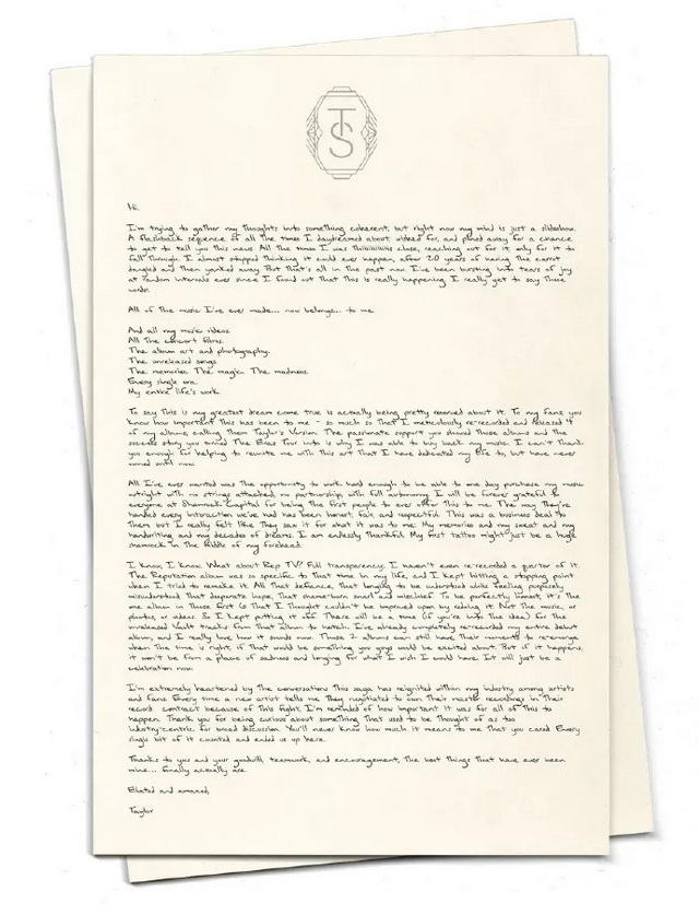 泰勒·斯威夫特在拿回自己的版权后,在INS发了长文陈述自己的心路历程。长文的最后她说:“我也因这段旅程激发了行业内外的对话而备受鼓舞。每一次新艺术家为了争取拥有自己的主权而重新谈判合约时,我都深深地体会到这场抗争的重要意义。”
